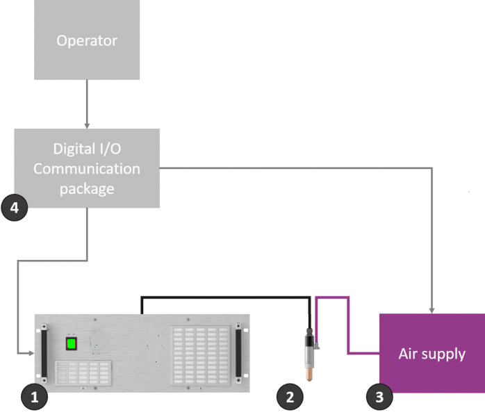 您需要的是干燥压缩空气供应,有可调节的系统压力和我们的小型I/O控制。从您的设备使用简单的I/O信号,您的系统被控制。这解决方案也适用几个等离子同时同步。
